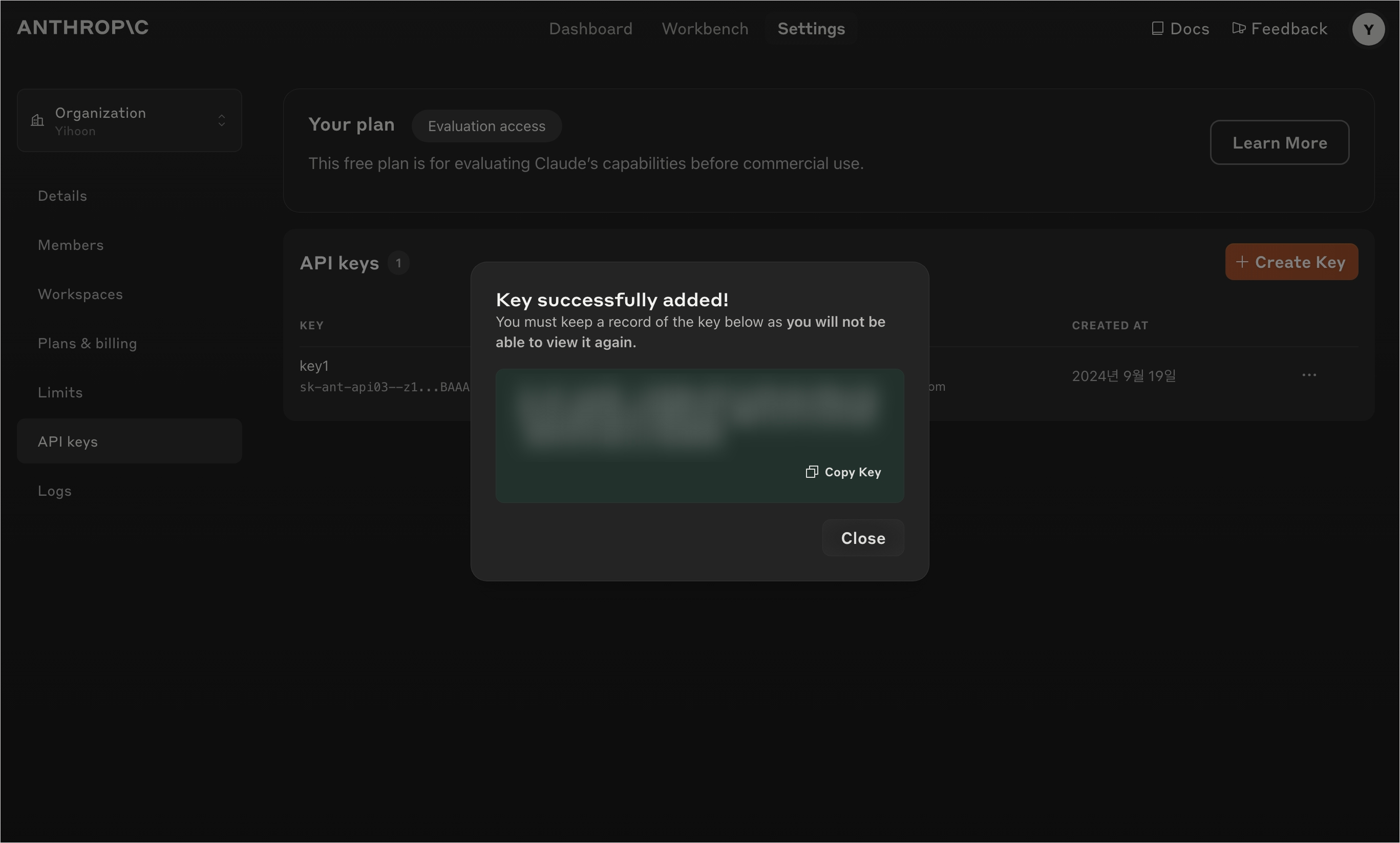 이어서 API 키를 발급한다. 이 키를 분실하면 다시 발급받아야 하므로 잘 보관해 두자.