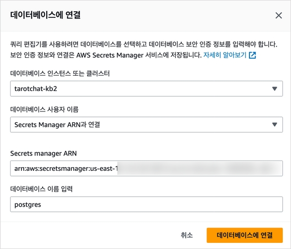 그리고 쿼리 편집기로 이동해서 해당 인스턴스에 접속한다. 물론 pgAdmin과 같은 별도 에디터를 사용해도 무방하다. 접속한 후 아래의 쿼리들을 날리자.