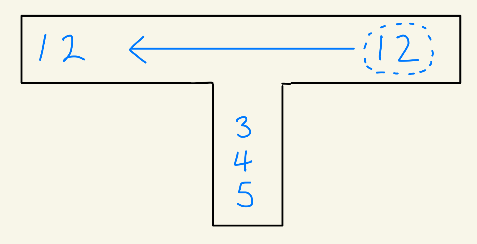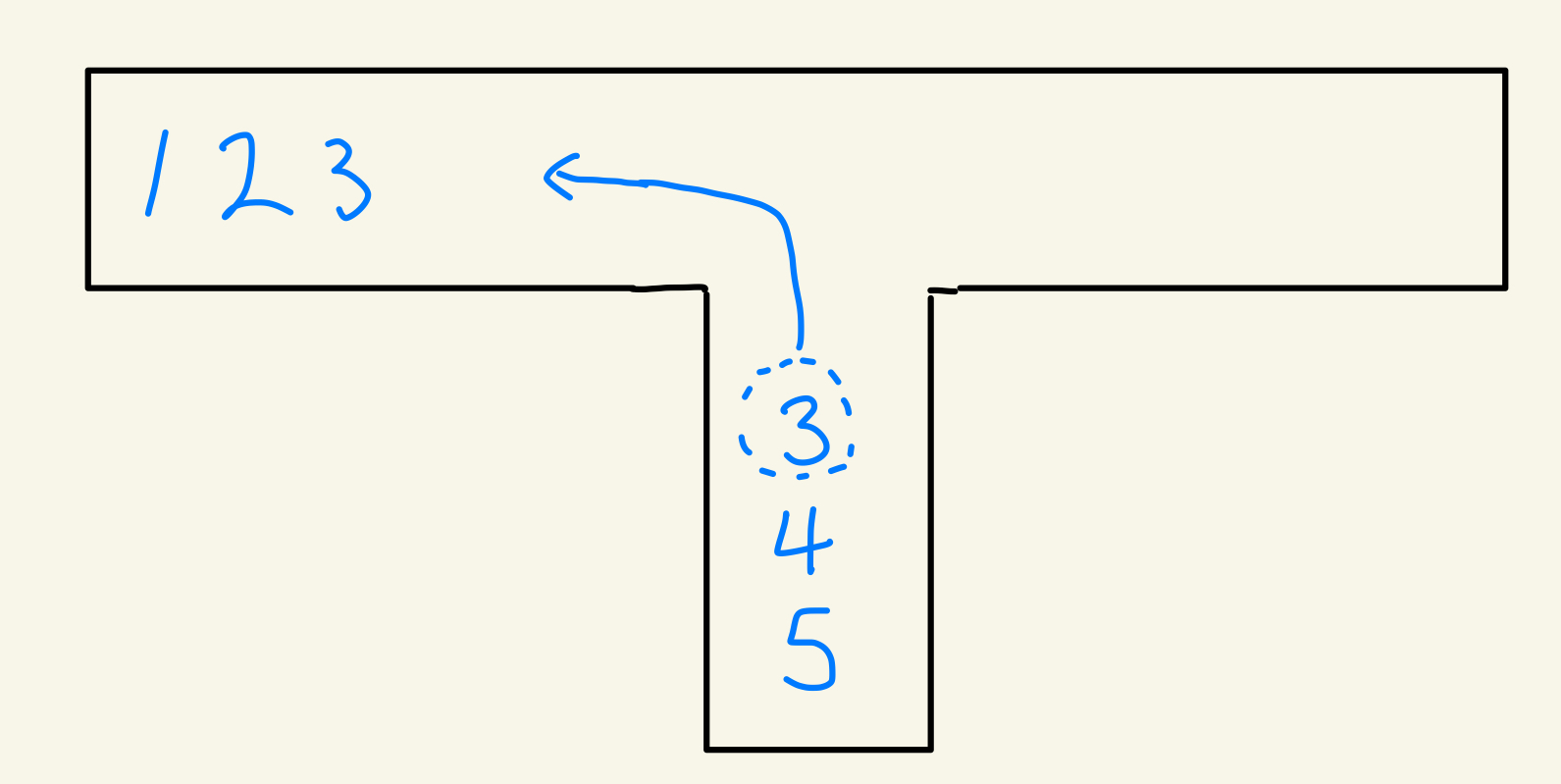 그 후, 대기열의 요소들을 하나씩 검증하며 해당 요소가 간식 줄로 이동이 가능한지 확인하여야 한다. 대기열에 가장 늦게 들어간 요소 3이 제일 먼저 검증의 대상이 되는데, 3은 바로 간식 줄에 진입할 수 있다.