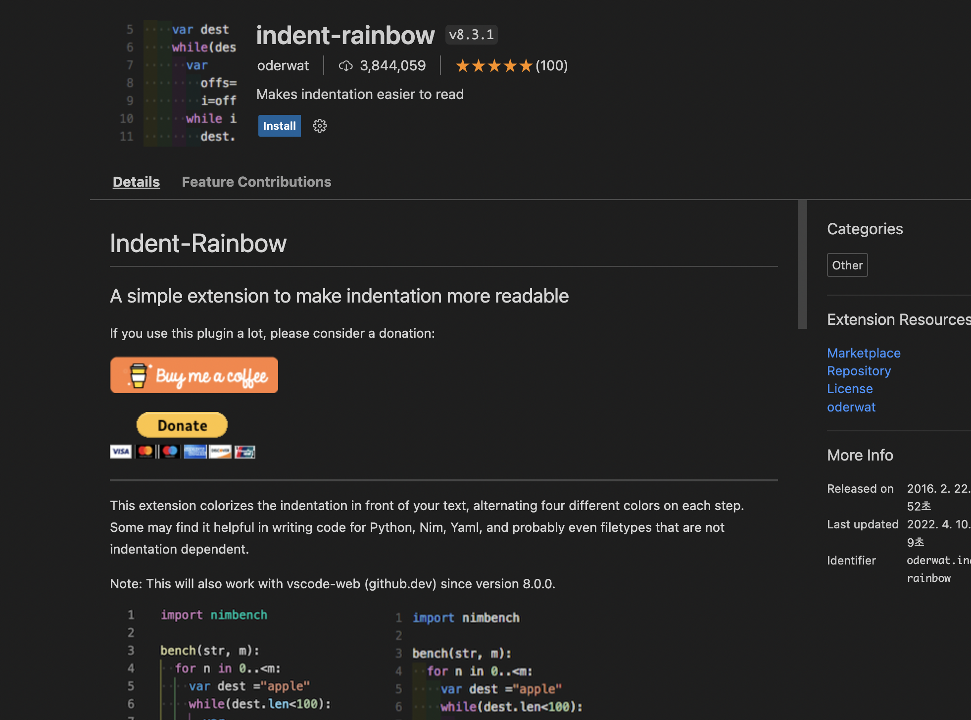 들여쓰기 된 부분이 rainbow 컬로로 하이라이트 돼 있어 코드를 읽을 때 한눈에 알아보기 쉽게 도와준다.