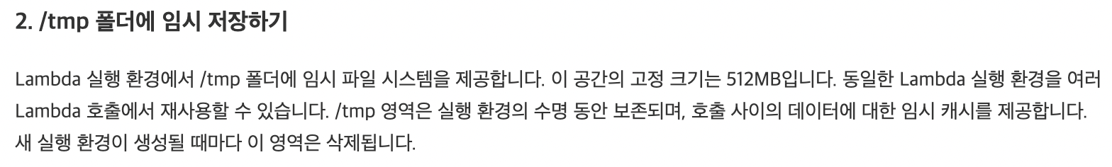 aws lambdalayer에는 임시 파일을 저장할 수 있는 /tmp 디렉토리를 제공합니다.