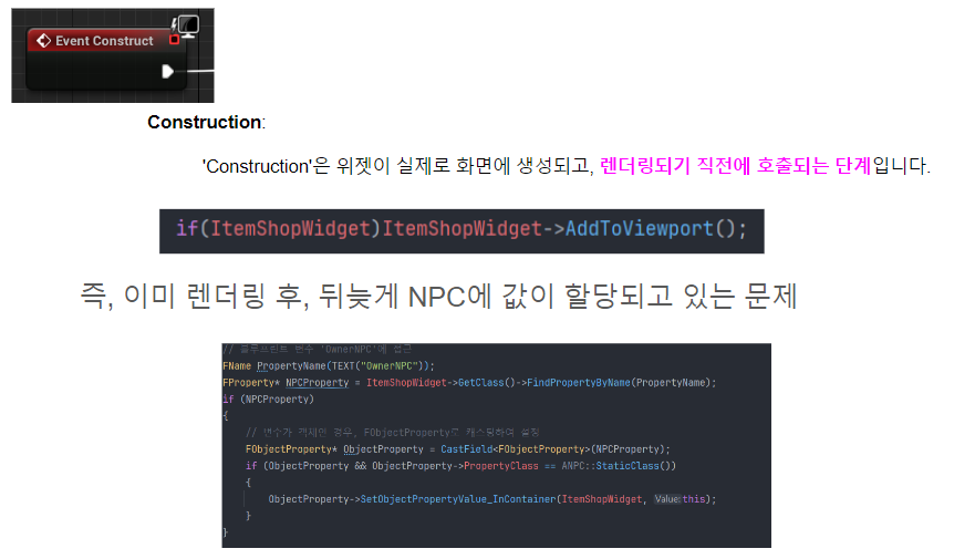 - 만약 'OwnerNPC'라는 변수를 블루프린트 위젯에서 찾지 못했다면 _NPCProperty는 nullptr이 됩니다.