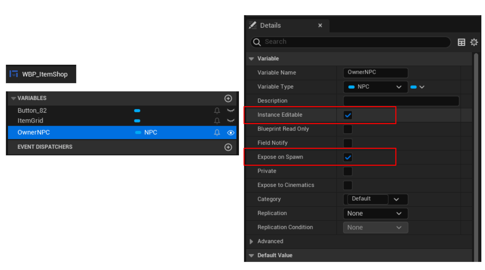 - 'Expose on Spawn'가 활성화된 NPC 변수를 설정