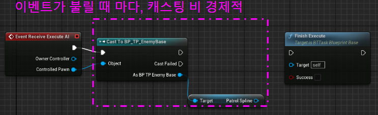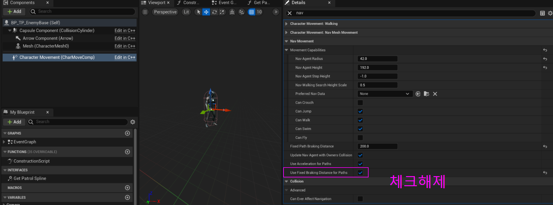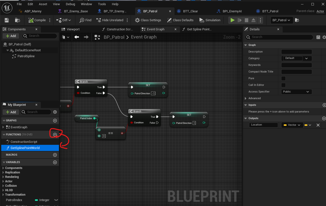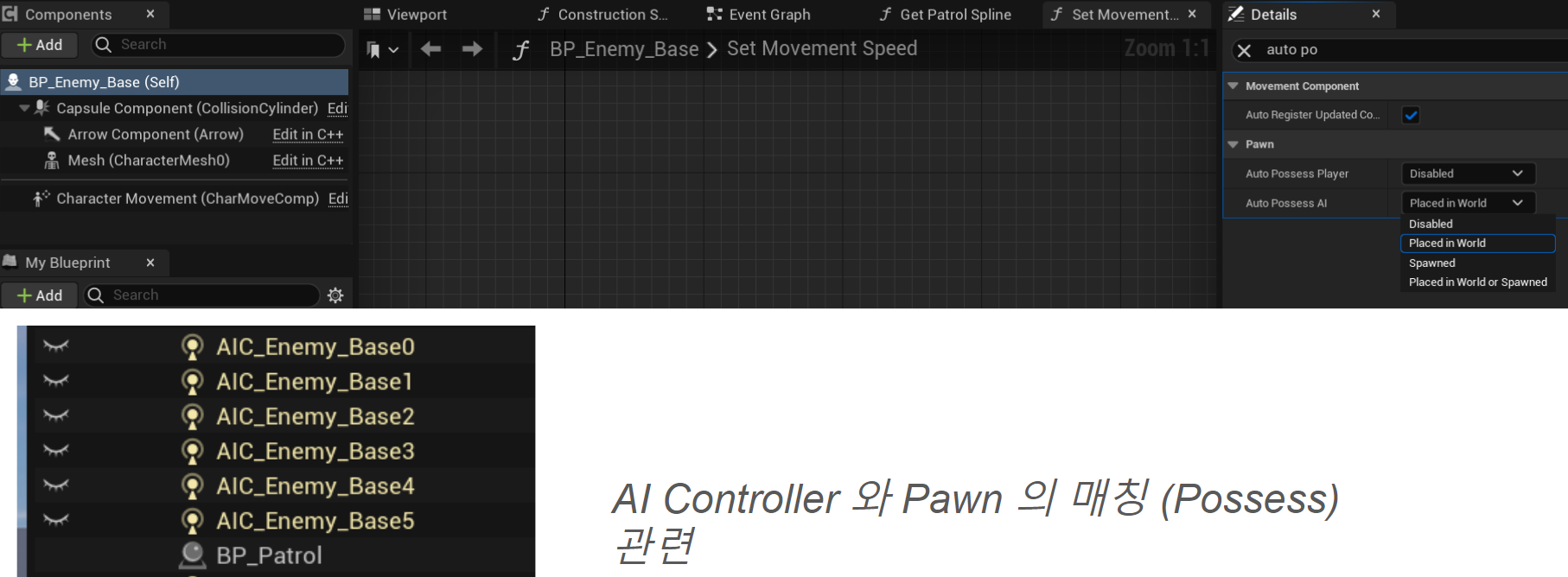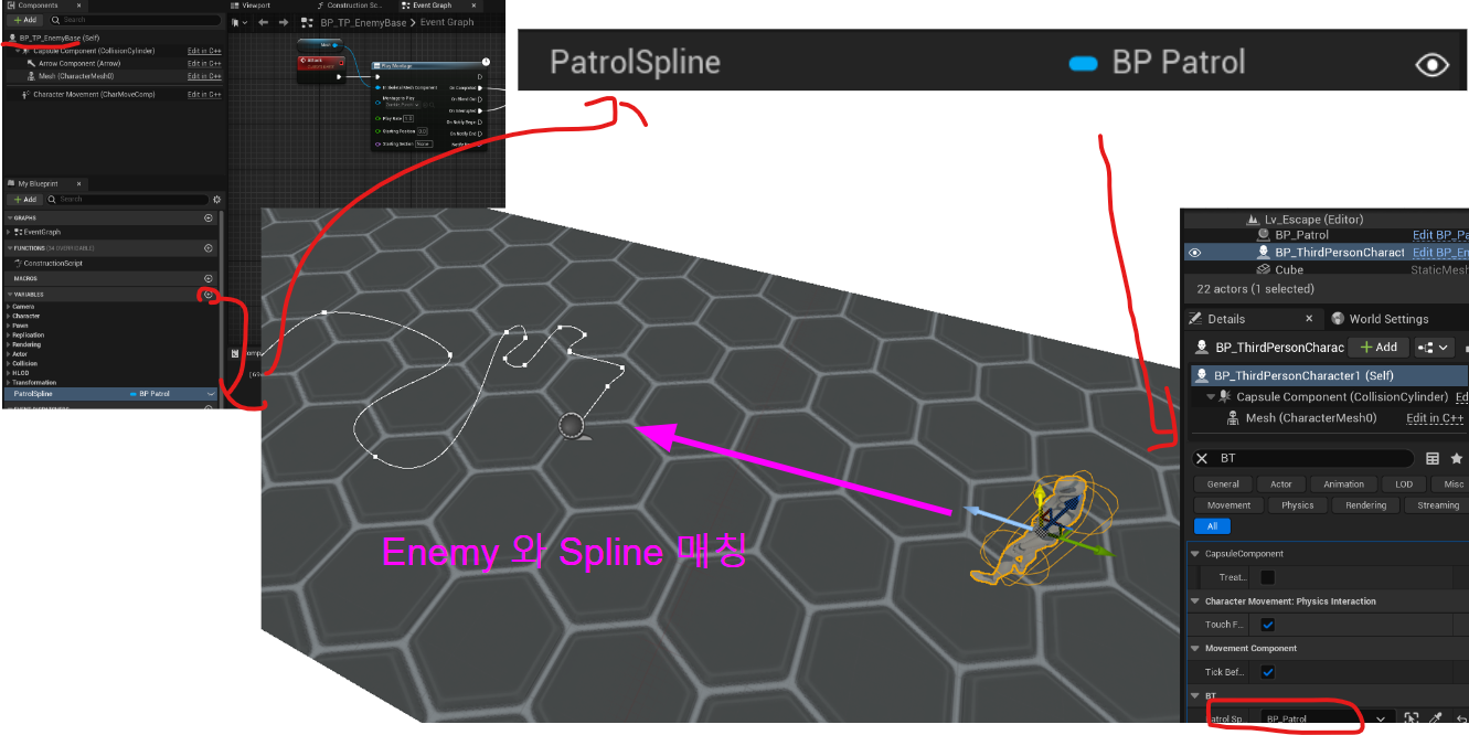 - Enemy 블루프린트로 어가 PatrolSpline이라는 블루프린트변수를 하나 만들고 뷰포트에 배치 한뒤 해당 PatrolSpline 과 매칭 시켜 준다