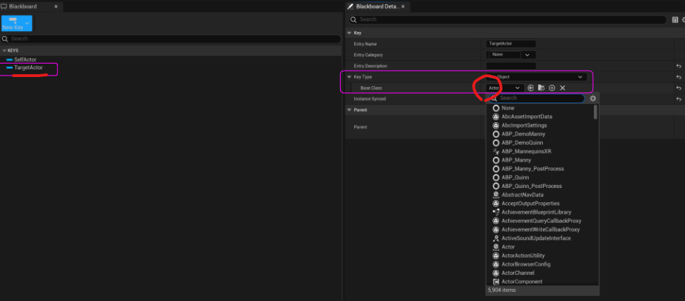 - 블랙보드에 키를 추가하고, 이름을 TargetActor로 설정 후, Base class 를 Actor로 지정 한다