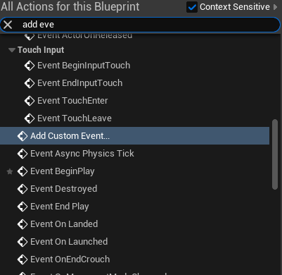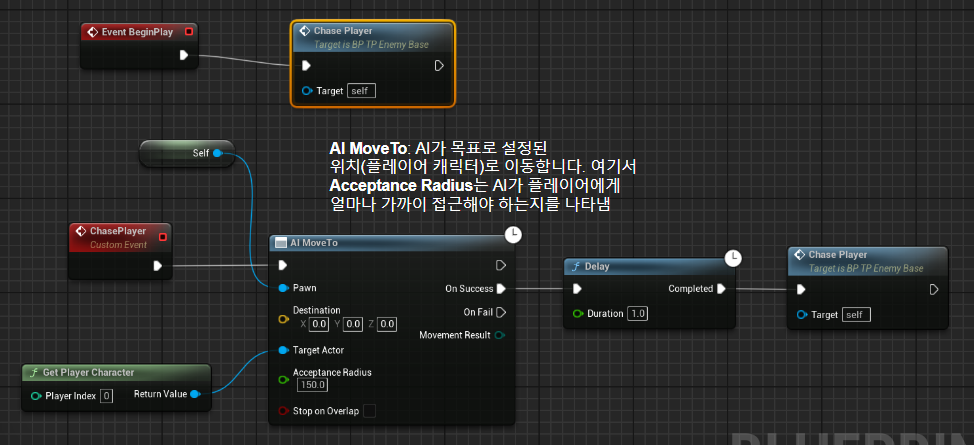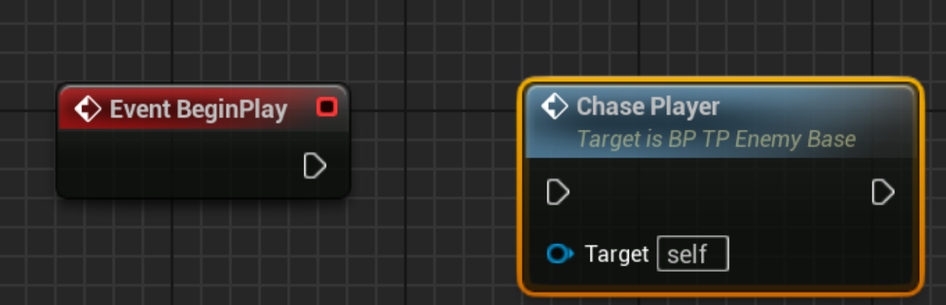 - 이후 해당 블루프린트 Event Graph로 가서 Custom Event 하나를 만들고 "ChasePlayer"라고 이름 짓는다