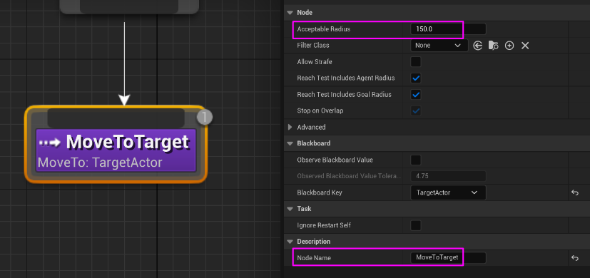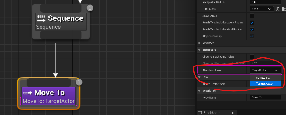 - Move To 노드를 누르고, Blackboard Key를 TargetActor 로 지정한다