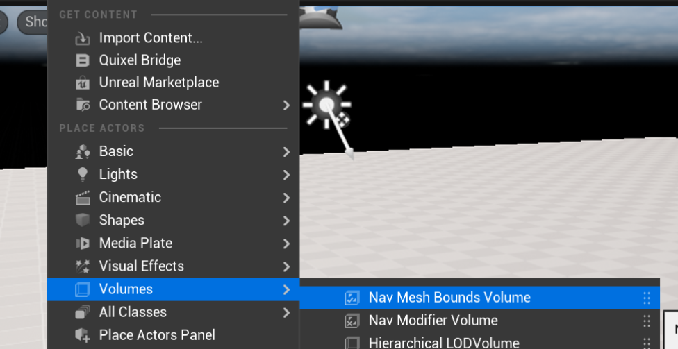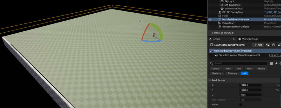 - 월드로 넘어가서 Nav Mesh Bounds Volume를 하나 만들고 크기를 설정한다