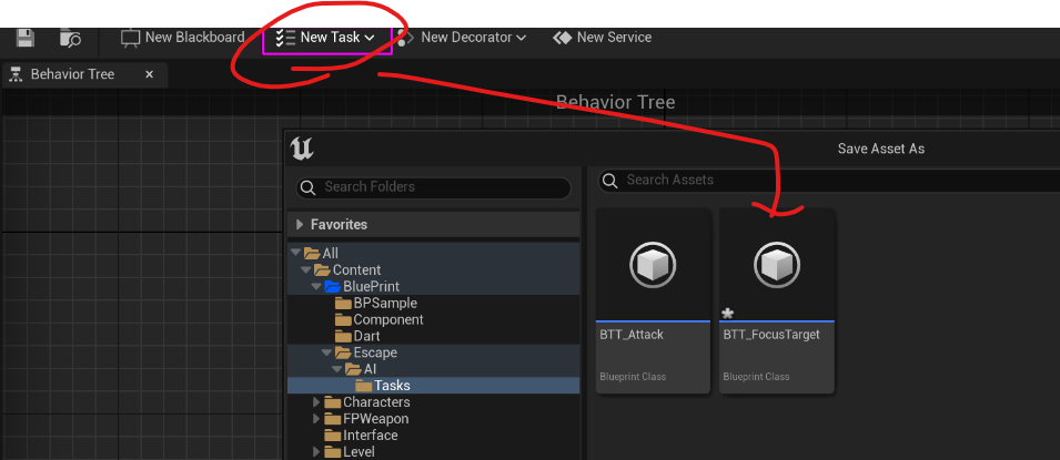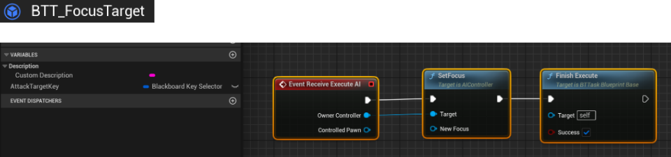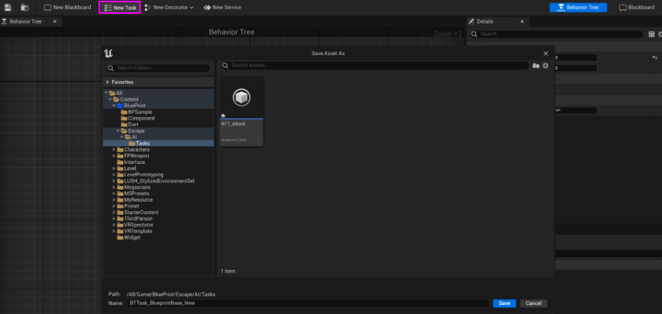 Tasks : AI가 실행할 개별 행동들을 정의합니다. 각각의 태스크는 특정 행동이나 조건을 수행하며, Behavior Tree 내에서 실행됩니다. 예를 들어, "체크 건강 상태", "목표까지 거리 측정" 같은 기능들을 수행