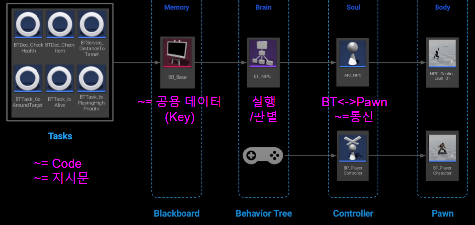Behavior Tree (Brain) : AI의 의사결정 프로세스를 담당하며, 블랙보드 데이터를 이용해 태스크를 순차적으로 실행하거나 선택