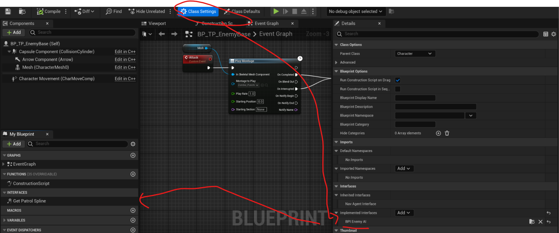 - Enemy블루프린트에 ClassSetings 를 누르고 Interface를 등록 한다