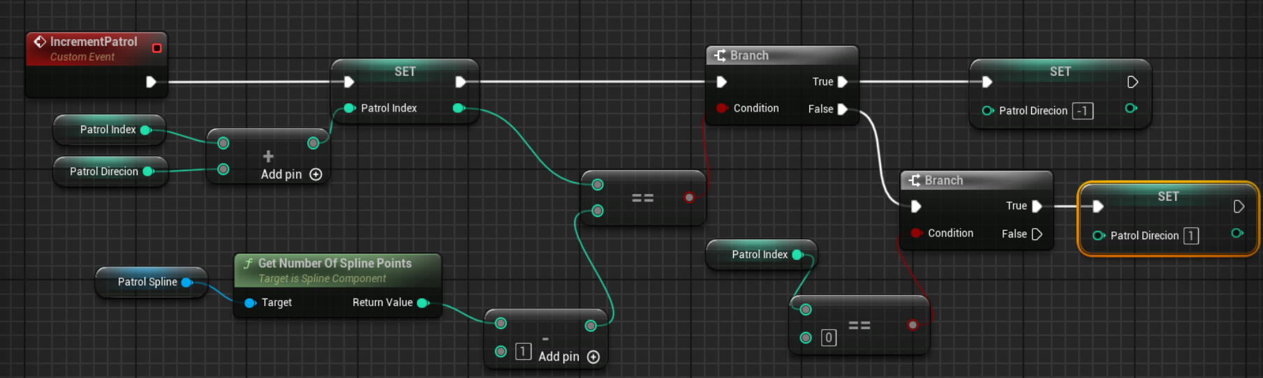 - Event Graph 으로 넘어가 Custom Event의 IncrementPatrol이라는 이름을 짓고 하나 만든다