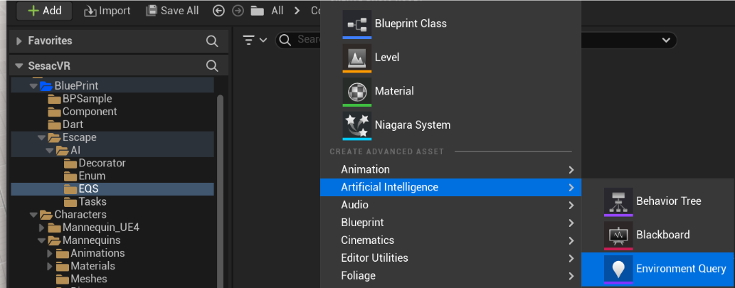 Unreal Engine의 AI Perception과 EQS(Query System)는 게임에서 AI가 주변 환경을 인식하고 판단하는 데 사용되는 도구