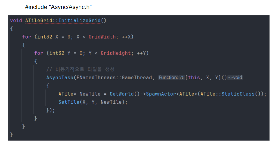 Async(EAsyncExecution::ThreadPool, []() { // 백그라운드 스레드풀에서 실행할 작업 UE_LOG(LogTemp, Warning, TEXT("This is running in the thread pool!")); });