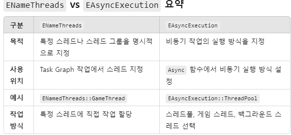 - ENameThreads는 주로 작업이 실행될 스레드나 스레드 그룹을 명시적으로 지정할 때 사용됩니다. Unreal Engine은 여러 스레드와 스레드 풀(Task Graph)을 사용하여 작업을 효율적으로 분산 처리합니다.