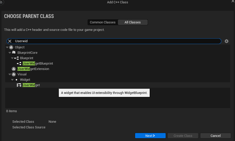 를 추가 한다MainUI도 C++ 클래스로 제어하기 위해 C++ 클래스 UserWidget 클래스로 CMainUI 라는 이름의 클래스를 하나만든다
