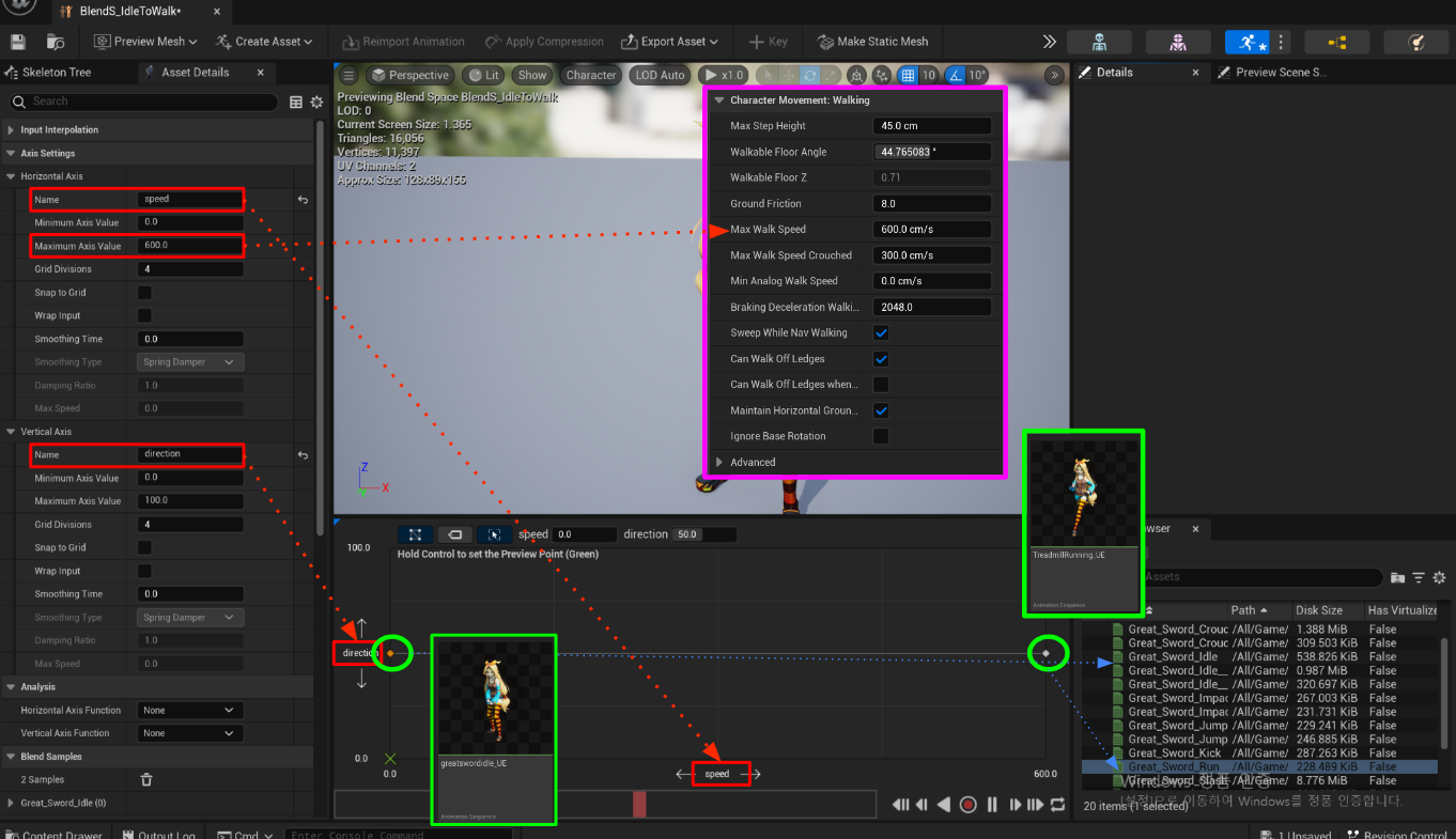 - 현재 캐릭터 속도에 따라서 BlendSpace에 적용된 두 Animation이 Blending 되어 표현