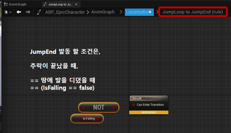 - Character의 필수 구성 요소인 Character Movement Comp 에서 ‘IsFalling’이라는 Boolean을 우리가 만든 IsFalling 변수에 연결