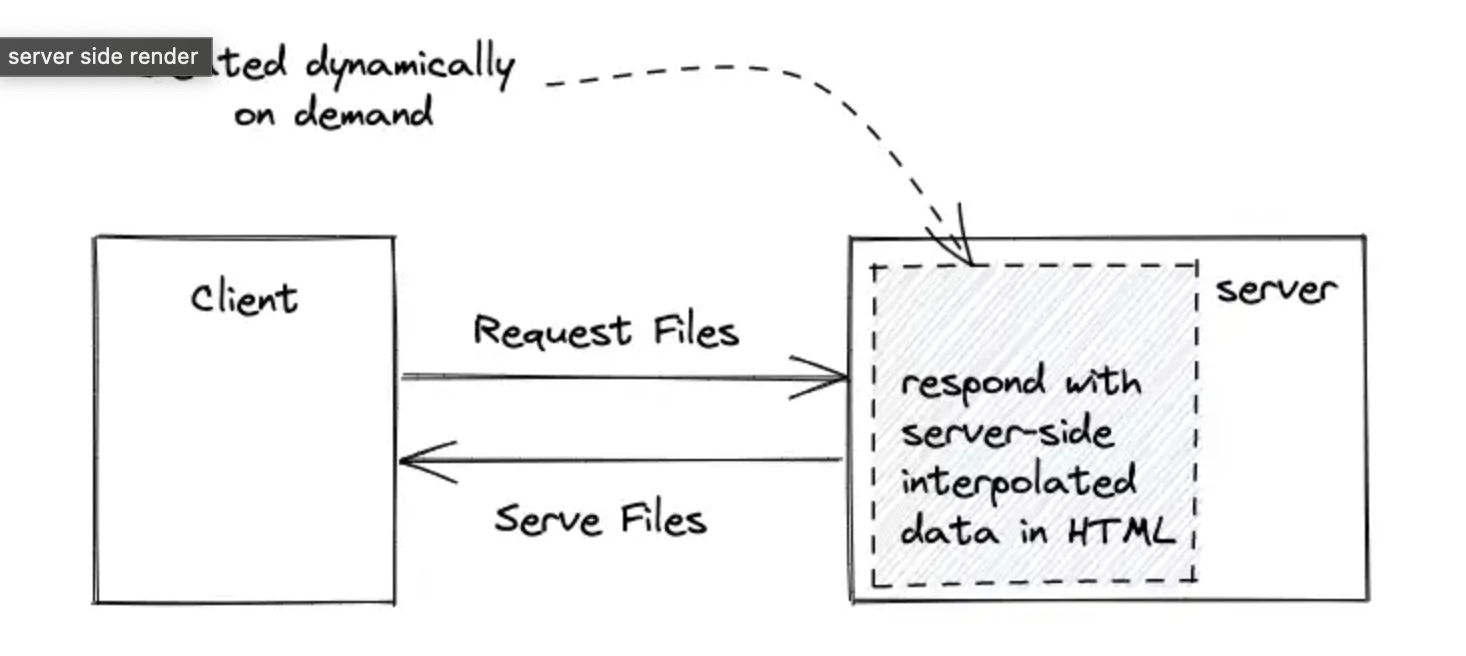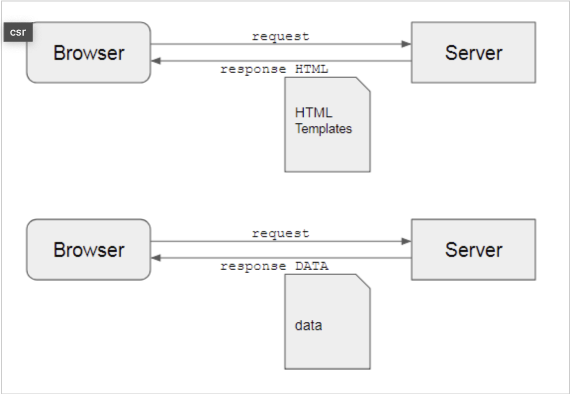 Browser가 URL을 통해 서버로 요청을 하면 서버는 요청에 맞는 화면(HTML)에 데이터가 덧붙은 상태의 완성된 HTML을 response 하였고. 화면에 렌더링 하기 위한 내용을 서버에서 만들었기 대문에 서버 사이드 렌더링이라고 불리게 되었다.