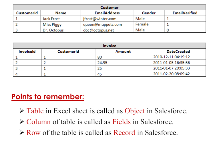 오브젝트는 필드(Field)로 구성되며, 각 필드는 특정 종류(예: 텍스트, 날짜, 숫자 등)의 데이터를 저장합니다. 저장된 각각의 행들은 Record로 불립니다.