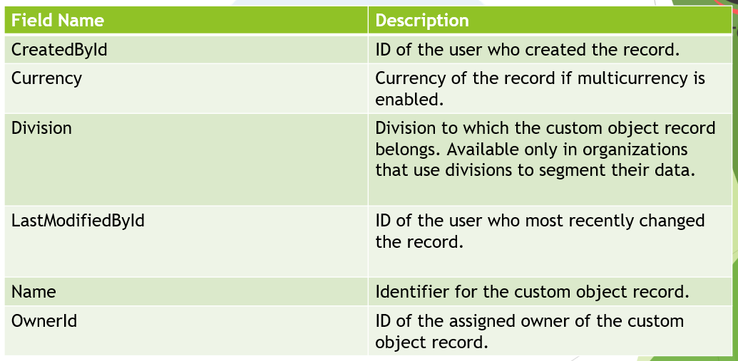 커스텀 오브젝트를 생성하면 위와 같은 표준필드가 사전에 정의되어 있습니다. Currency는 multicurrency가 활성화 되어 있어야 하고, Division은 조직에서 데이터를 구분하기위해 divisions를 사용해야 제공됩니다.