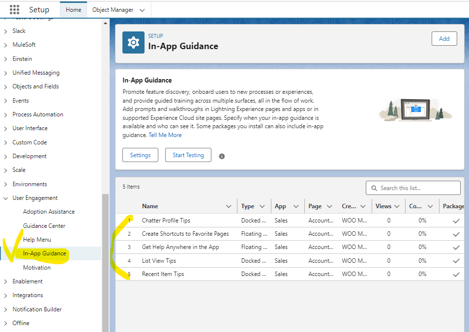 Quick Find에서 In-App Guidance 메뉴에 접근하면 설치된 프롬프트를 조회할 수 있습니다.