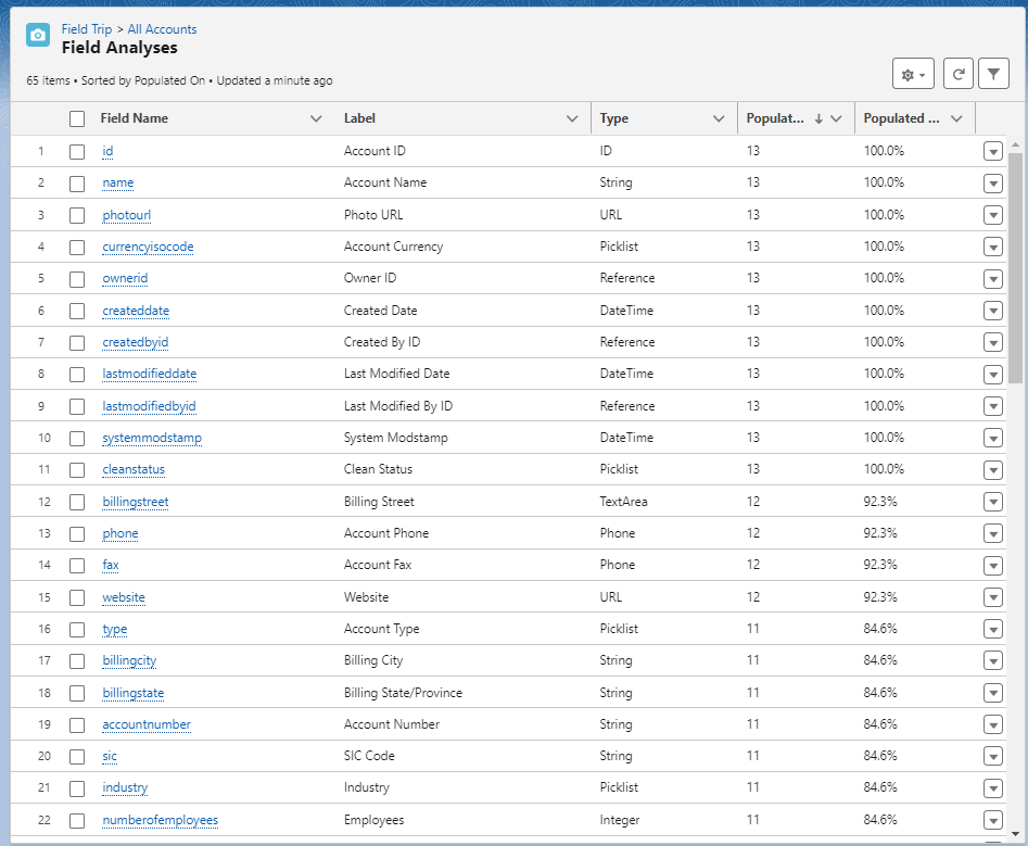 완료되면 Related lists에서 Field Analyses의 데이터를 통해 분석 결과를 알 수 있습니다. 각 필드가 몇개의 레코드에서 값이 입력되었고 사용률은 어떠한지 알 수 있습니다.
