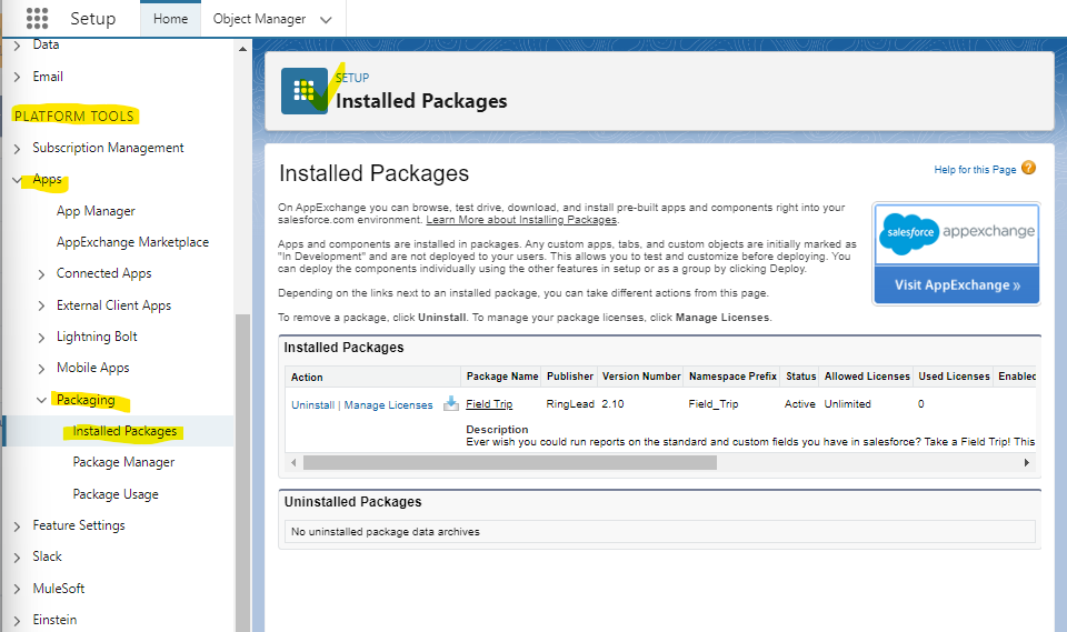 설치가 완료되면 Setup의 Installed Package로 리다이렉트되며 해당 메뉴에서 인스톨된 목록을 확인하고 관리할 수 있습니다.