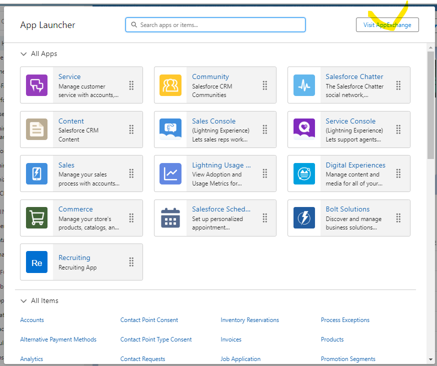 App Laucher에서 Visit AppExchange 버튼을 통해 접근할 수 있습니다.