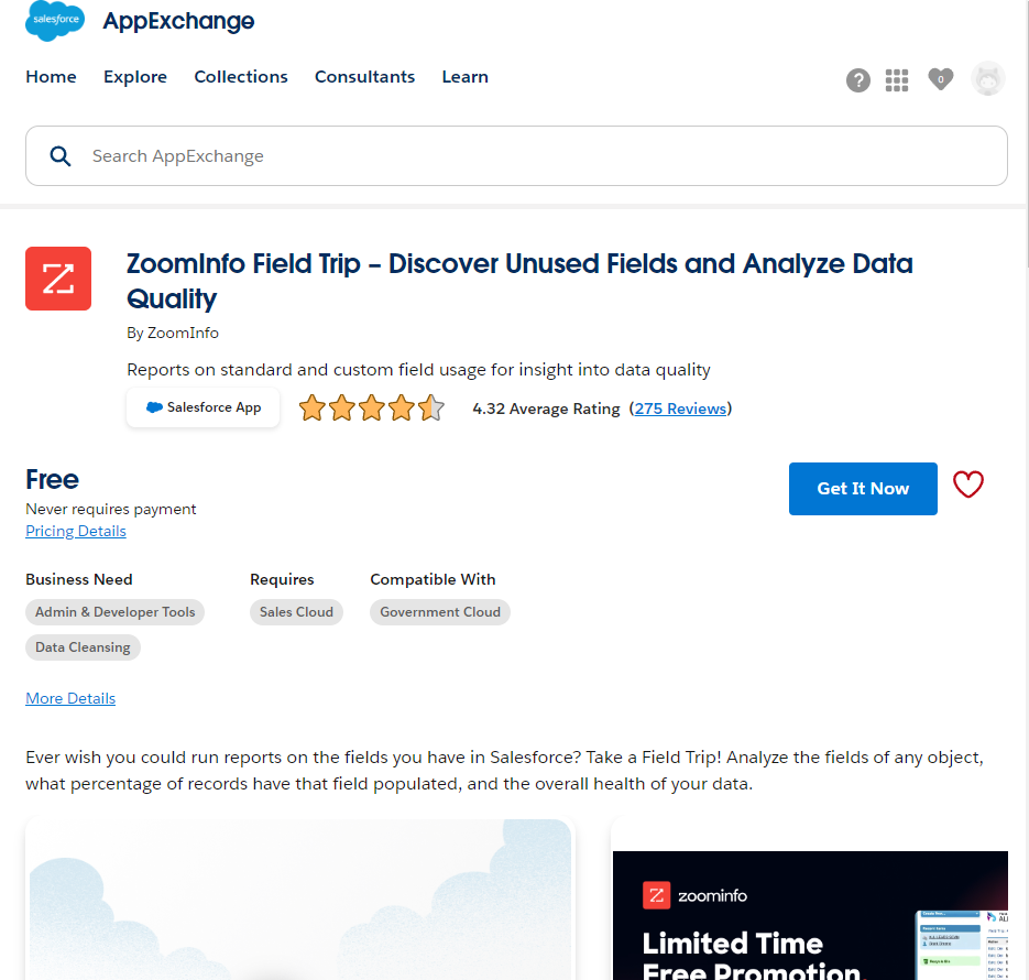ZoomInfo Field Trip을 검색해서 Get It Now 버튼을 통해 제 Developer Edition 환경에 설치해보겠습니다.