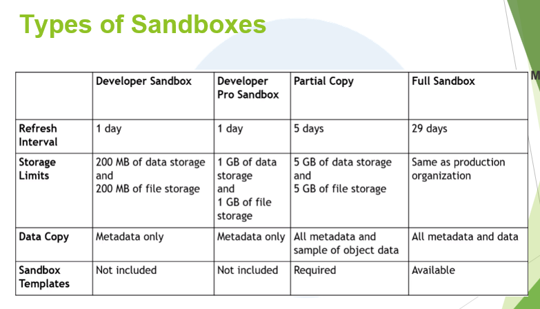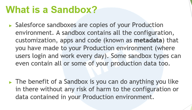 샌드박스는 프로덕션 환경의 복사본입니다. 샌드박스에는 프로덕션 환경(사용자가 매일 로그인하고 작업하는 곳)에 적용된 모든 구성, 커스터마이징, 애플리케이션 및 코드(메타데이터라고 함)가 포함되어 있습니다. 일부 샌드박스 유형은 프로덕션 데이터의 전부 또는 일부까지도 포함할 수 있습니다.