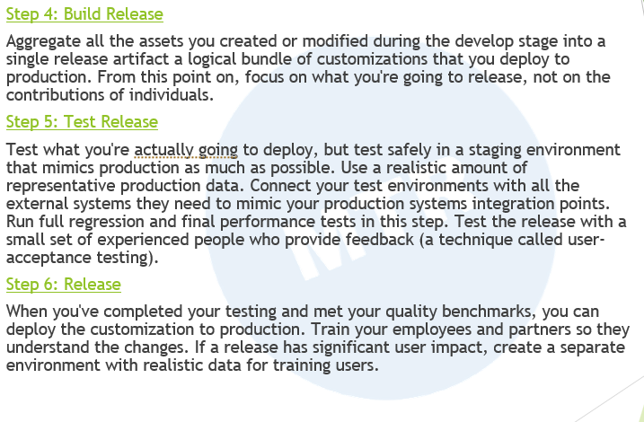 품질 기준 충족 및 생산 배포: 테스트를 완료하고 품질 기준을 충족하면, 커스터마이징을 생산 환경에 배포할 수 있습니다. 변화를 이해하도록 직원과 파트너를 교육합니다. 출시가 사용자에게 상당한 영향을 미칠 경우, 실제 데이터를 사용하여 사용자를 교육하기 위한 별도의 환경을 생성합니다.