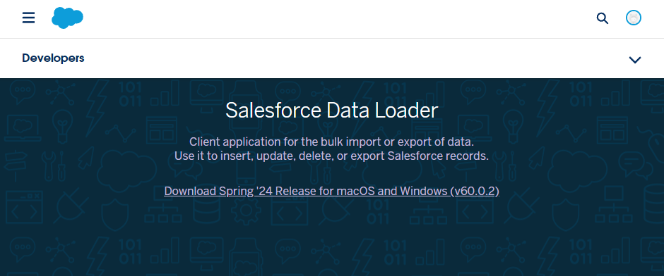 데이터 로더(Data Loader)는 Salesforce에서 제공하는 독립 실행형 응용 프로그램입니다. 데이터 로더를 사용하려면 소프트웨어를 사용자의 로컬 컴퓨터에 설치해야 합니다.