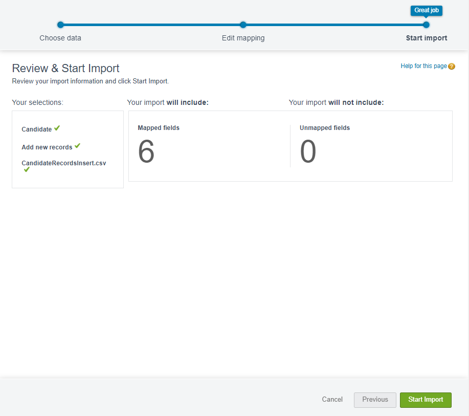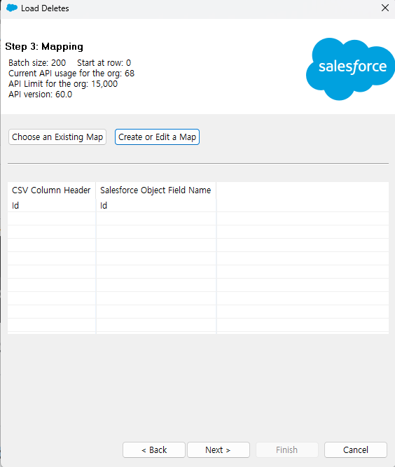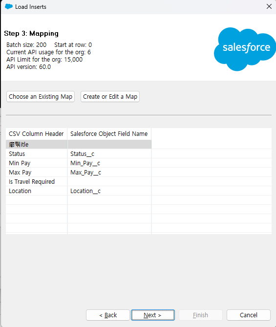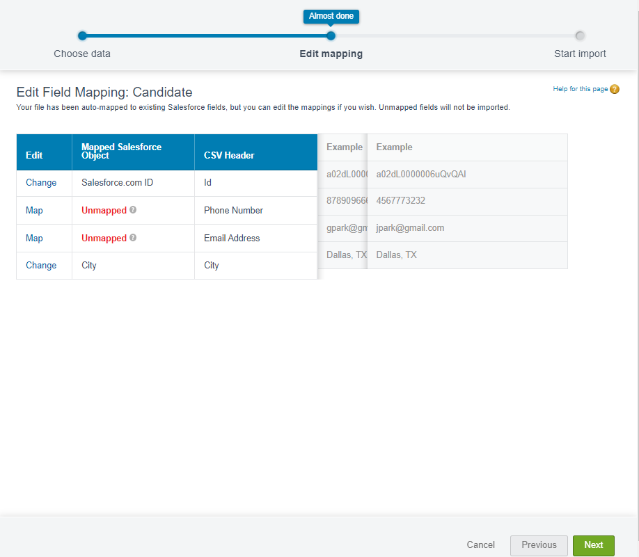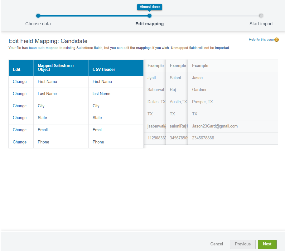 Data Loader를 사용했을때와 마찬가지로 Obejct의 필드와 CSV 파일의 칼럼을 맵핑하는 단계입니다. 필드명과 칼럼명을 동일하게 설정하니 자동으로 맵핑된 것 을 볼 수 있습니다. 변경이 필요한경우 Change 버튼을 눌러 맵핑을 수정할 수 있습니다.
