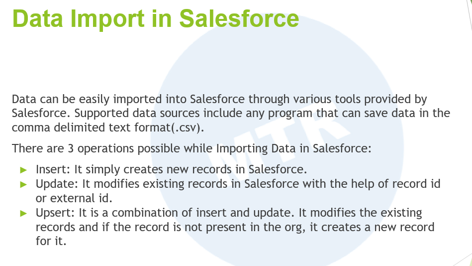 Upsert(업서트): 삽입과 업데이트를 결합한 작업입니다. 기존 레코드를 수정하고 조직에 레코드가 없는 경우 새 레코드를 생성합니다. 이 작업은 데이터를 가져올 때 기존 레코드와 새 레코드가 혼합된 상황에서 유용하게 사용될 수 있으며, 레코드가 이미 존재하는지 여부에 관계없이 데이터를 세일즈포스에 정확히 맞추고 싶을 때 사용됩니다.