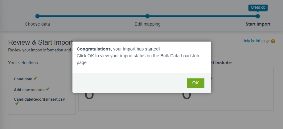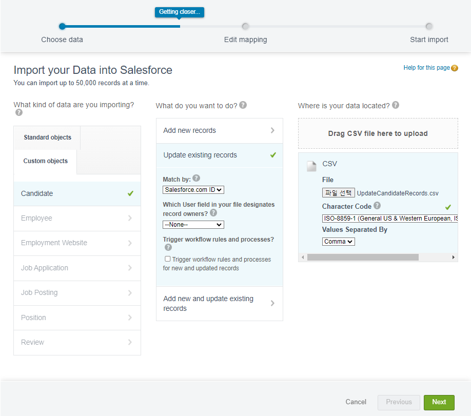 Candidate Object를 선택해주고 Update시엔 식별자값이 꼭 필요하여 파일에 포함했으므로 세일즈포스가 해당 식별자를 인식할 수 있도록 Match by에 Salesforce.com ID를 선택해줬습니다.