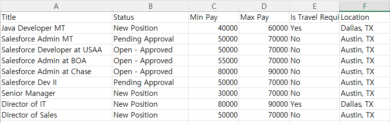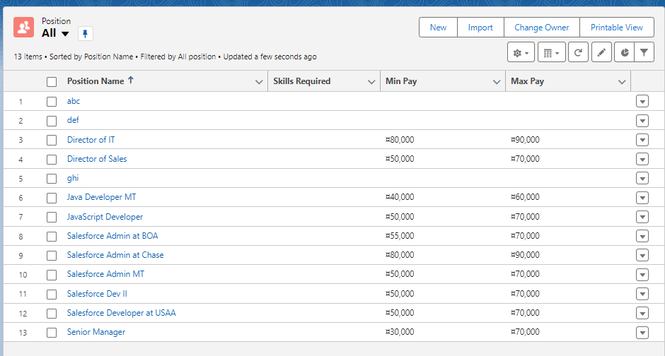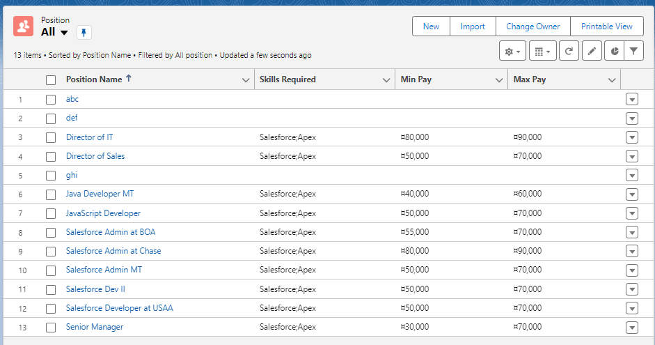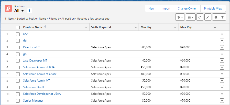 현재 존재하는 Position 레코드들은 SKills Required 필드의 값이 비어있습니다. 해당 필드들을 Data Loader의 Update 기능을 통해 수정해보도록 하겠습니다.