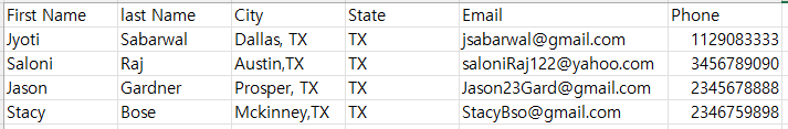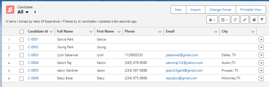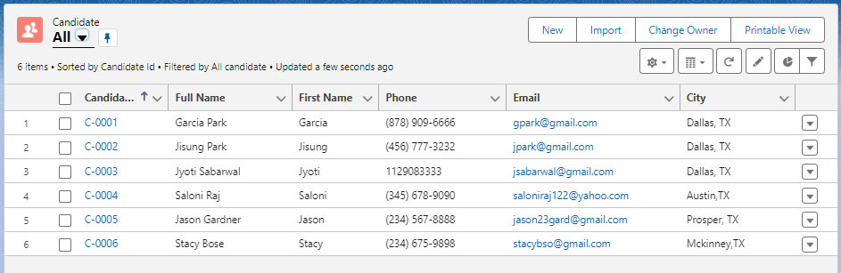 채용할 포지션에 지원할 지원자의 레코드를 관리하는 오브젝트인 Candidate에 Data Import Wizard를 통해 데이터를 생성해보도록 하겠습니다. 삽입할 데이터는 위와 같습니다.