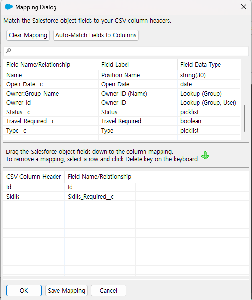 상단의 섹션은 Position Object의 필드이고 아래는 CSV파일의 칼럼과 필드를 맵핑하는 섹션입니다.