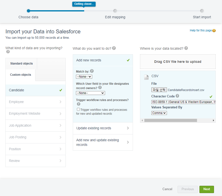 Candidate Object를 선택하고 Add new records를 선택하니 아래 세가지 옵션이 제공됩니다.