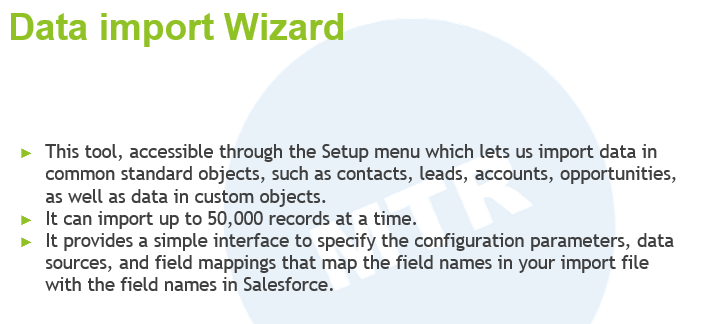Salesforce 제공 도구를 통해 데이터를 Salesforce에 쉽게 가져올 수 있습니다. 지원되는 데이터 소스에는 쉼표로 구분된 텍스트 형식(.csv)으로 데이터를 저장할 수 있는 모든 프로그램이 포함됩니다. Salesforce에서 데이터를 Import할때 가능한 3가지 옵션은 다음과 같습니다: