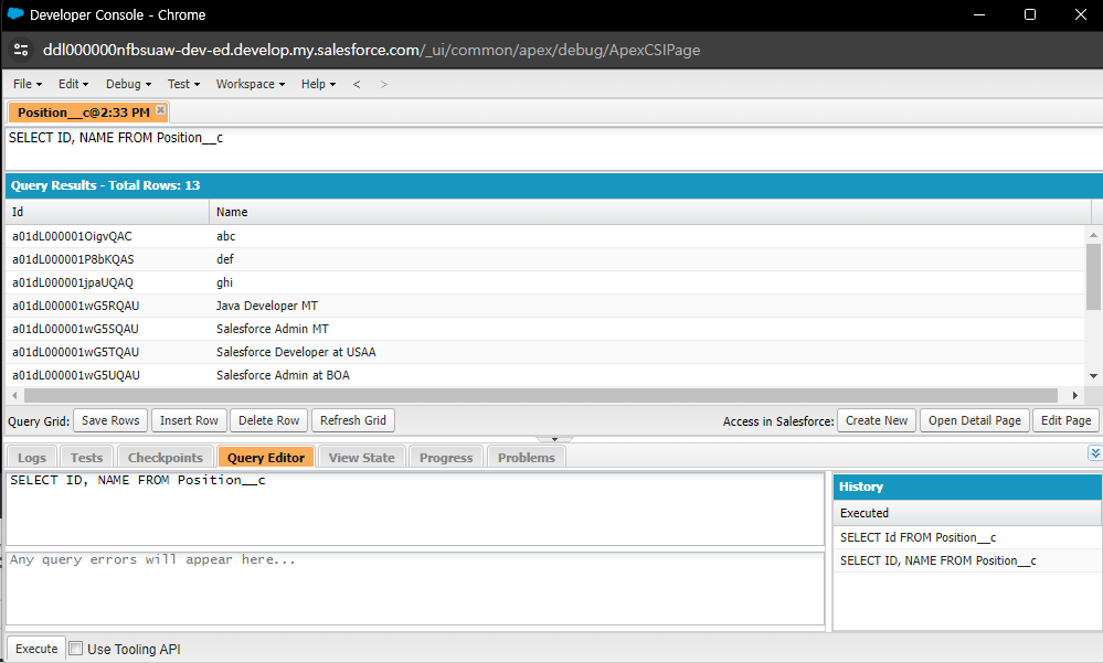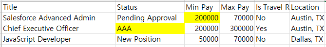첫번째 항목은 Min Pay가 Max Pay보다 큰 값을 포함하고 있는데 이는 기존에 설정해놓은 Validation Rule에 해당되어 Insert가 되지 않아야 합니다.