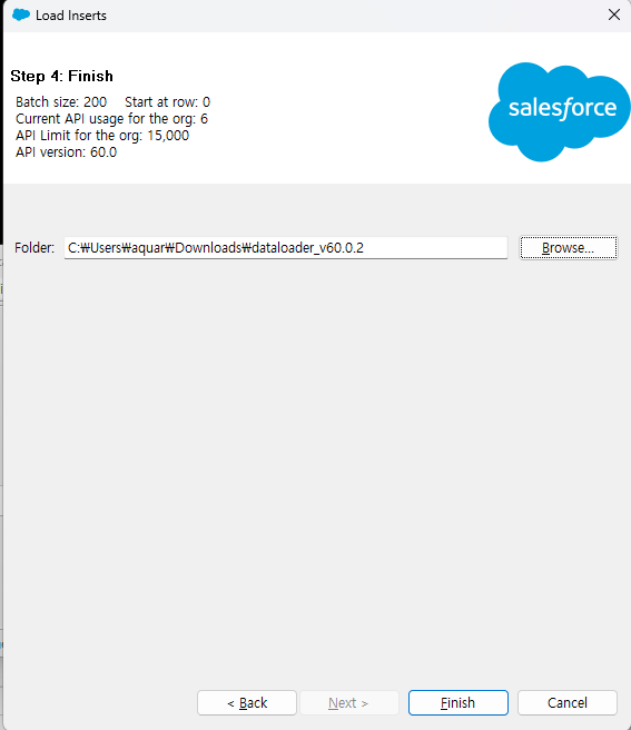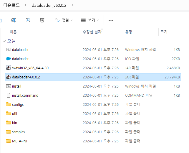 압축파일을 해제하면 install batch파일을 통해 설치할 수도 있고 dataloader-60.0.2 JAR파일을 통해 그냥 실행할 수도 있습니다.