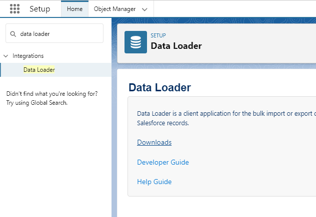 Setup의 Quick Find에서 Data Loader를 검색해서 접근할 수 있습니다. Downloads를 누르면 리다이렉트 됩니다.