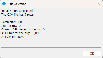 Next를 누르면 Initialization이 성공했다는 알림창이 나오면서 파일이 몇개의 로우를 갖고 있는지와 Insert 작업 관련된 정보들이 나옵니다.