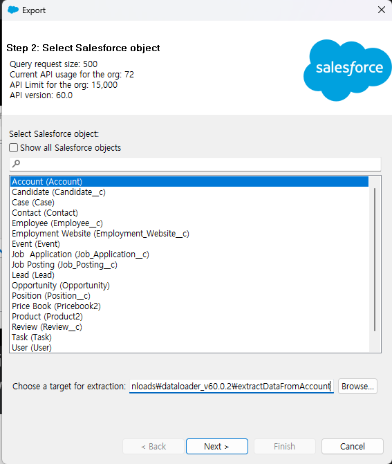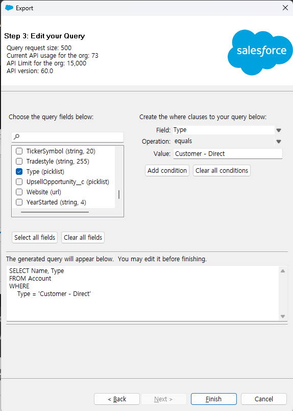 다음 스텝에서는 추출할 데이터를 쿼리를 통해 정의할 수 있습니다. 직접 쿼리를 작성할 수도 있지만, 편리하게도 선택한 Object의 필드를 편하게 조회할수 있고 체크하면 자동으로 SELECT문에 포함하여 쿼리를 생성해줍니다.