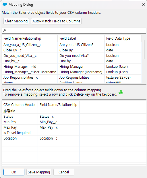 Auto-Match Fields to Columns를 누르면 자동으로 맵핑 가능한 필드들이 채워집니다. 자동을 맵핑되지 않는 경우 위에서 맞는 필드를 드래그앤드랍하여 맵핑할 수 있습니다.