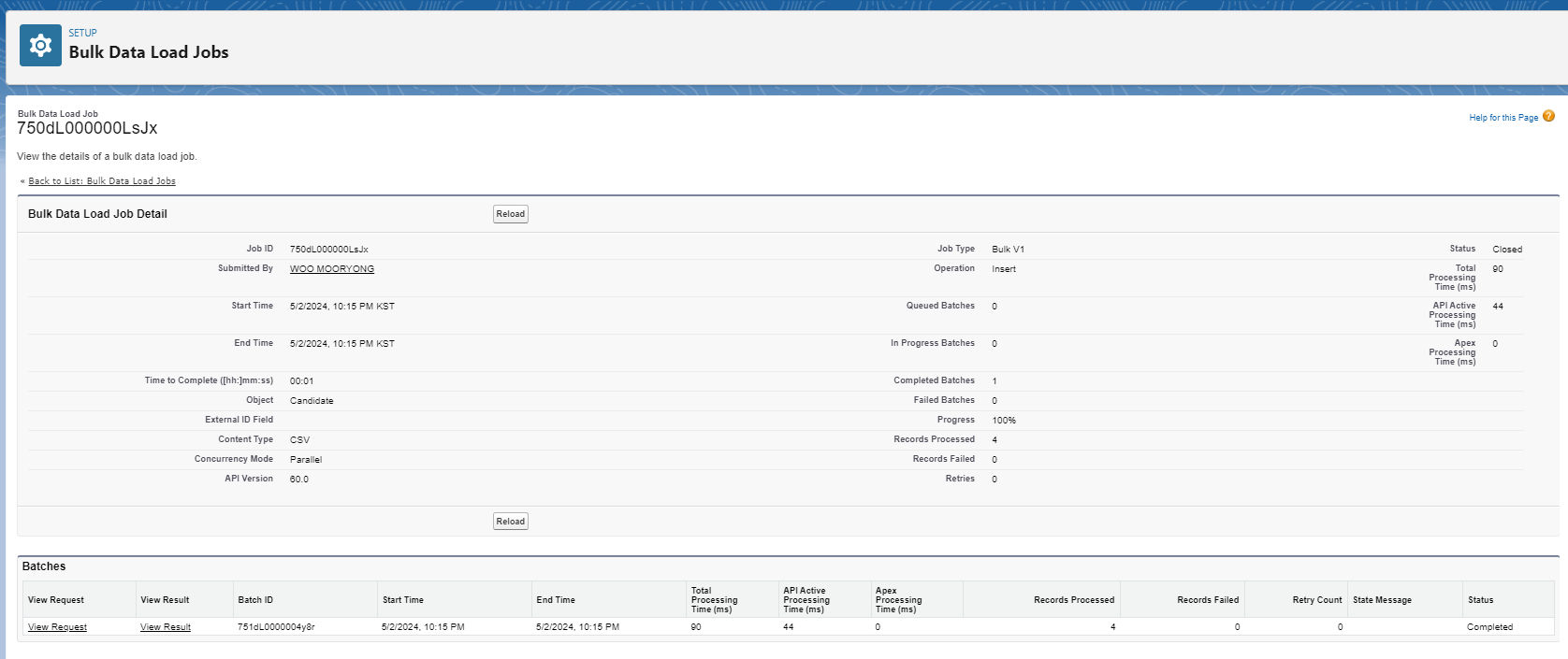 결과창에서는 다양한 세부내용들을 확인할 수 있습니다. Record Processed 4, Record Failed 0으로 4개 레코드가 정상 삽입된 것으로 보입니다.