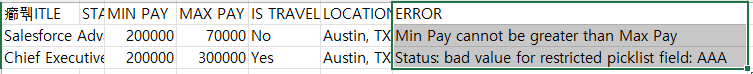에러 파일을 조회해보니 Validation Rule을 위반한 레코드는 ERROR 칼럼에 사전에 정의한 에러메시지가 표시되고 필드 제한사항을 어긴 레코드도 그에 맞는 에러메세지를 표기하는걸 볼 수 있습니다.