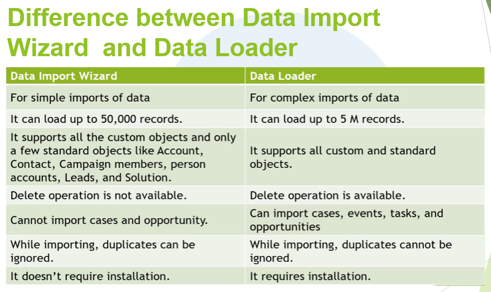 Data Loader와 Data Import Wizard간의 차이를 다시 한번 정리해보겠습니다.